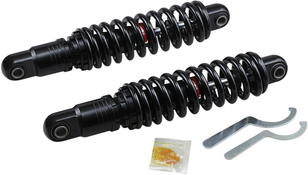 - Black shocks feature black springs and damper bodies with black end caps/eyelets