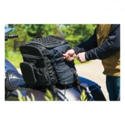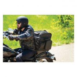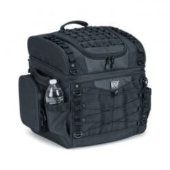 You and your bag, that’s what the Vagabond Bag is about. The tough strong look screams adventure and the size and versatility will offer all you can imagine for a weekend, or much longer, from a luggage carrying bag. An internal structure helps maintain shape, even when empty. Includes one top and one large bottom center compartments with internal zippered compartments. Two quick access side compartments for drink bottles an additional two zippered side compartments for speedy access. An additional padded top compartment leaves room for up to 13″ laptops. Made from UV-rated weather resistant 1200 denier textile. Includes a removable shoulder strap & carrying handle and multiple D-rings for secure attachment. Additionally a sissy bar strap system is included. Comes with a tethered rain cover for days you’d rather not see. Approx. dimensions: 18″ (45.7cm) wide x 12″ (30.5cm) deep x 15.5″ (39.4cm)tall. Capacity 2820 Cui (46 liters).