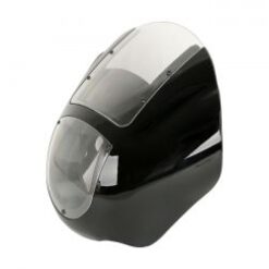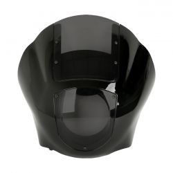 Gloss black. An ABS reproduction styled fairing with a plexiglass (acrylic) windscreen. Fork mounted fairing for FXR, Dyna and Sportster models with 39mm fork tubes and equipped with a docking hardware kit (note). Included is a universal mounting bracket. Offers hard core looks and minimized wind fatigue at highway speeds.
